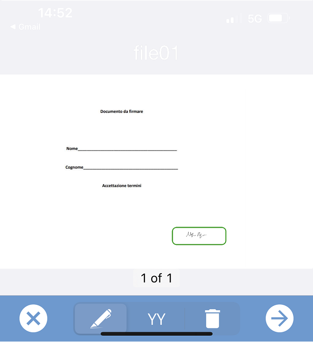 To insert a signature into the document, the user selects the signature or initials key at the bottom of the screen, and then taps the place in the document where they want to insert their signature. To delete a signature inserted by mistake simply select the trash can icon and then tap on the action you want to remove.