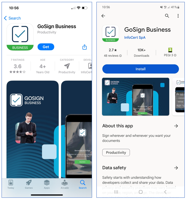 Once Google Play, Apple Store, or Microsoft Store are launched, you need to enter "GoSign Business" as a search item. A click on the Install or Get button (depending on the phone's system) allows you to go ahead and install the App.