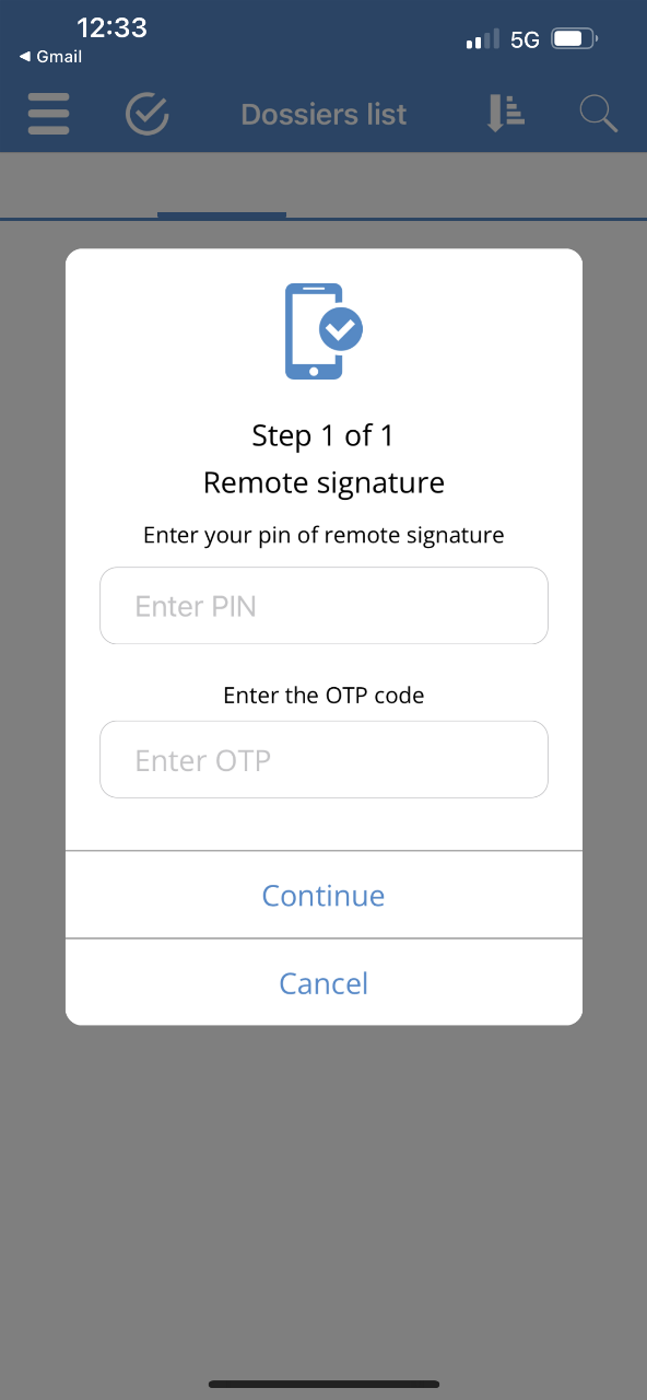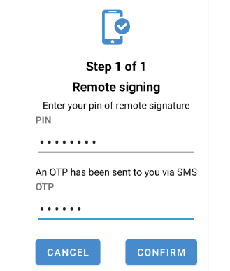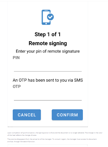 Based on the authorization level defined for the practice, the system requests the user's PIN as confirmation of recognition or the PIN and OTP of the digital certificate.