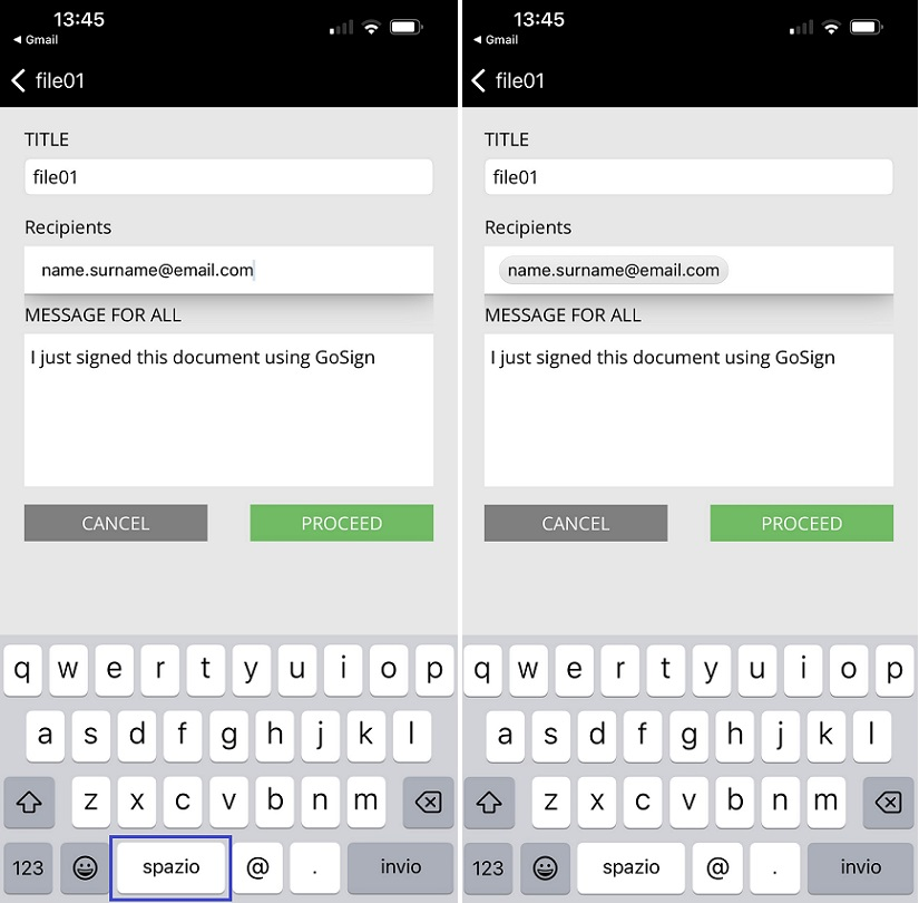 The field changes shape, the user's signature loaded on the system (if available) or the name written in italics appears, with the indication "press to cancel" (pressing again the confirmation is cancelled and the action returns to its original status).
