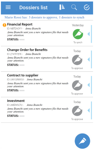 To confirm the signature affixed to the document it is necessary to synchronize GoSign through the pen's icon button (Floating Action Button) that appears in the list of documents at the bottom right.