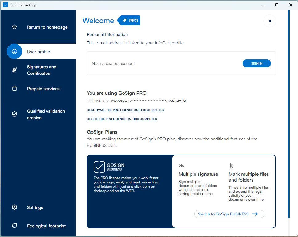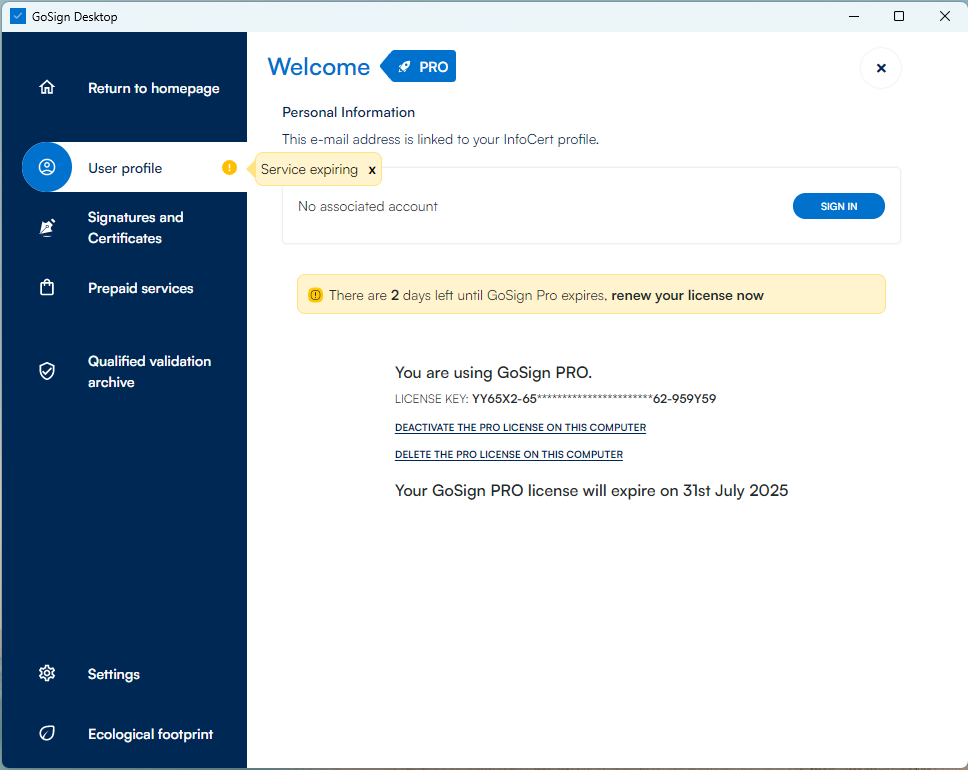 On GoSign Desktop, in the "User profile" section, you can see - if active - the expiry date of the GoSign PRO license.