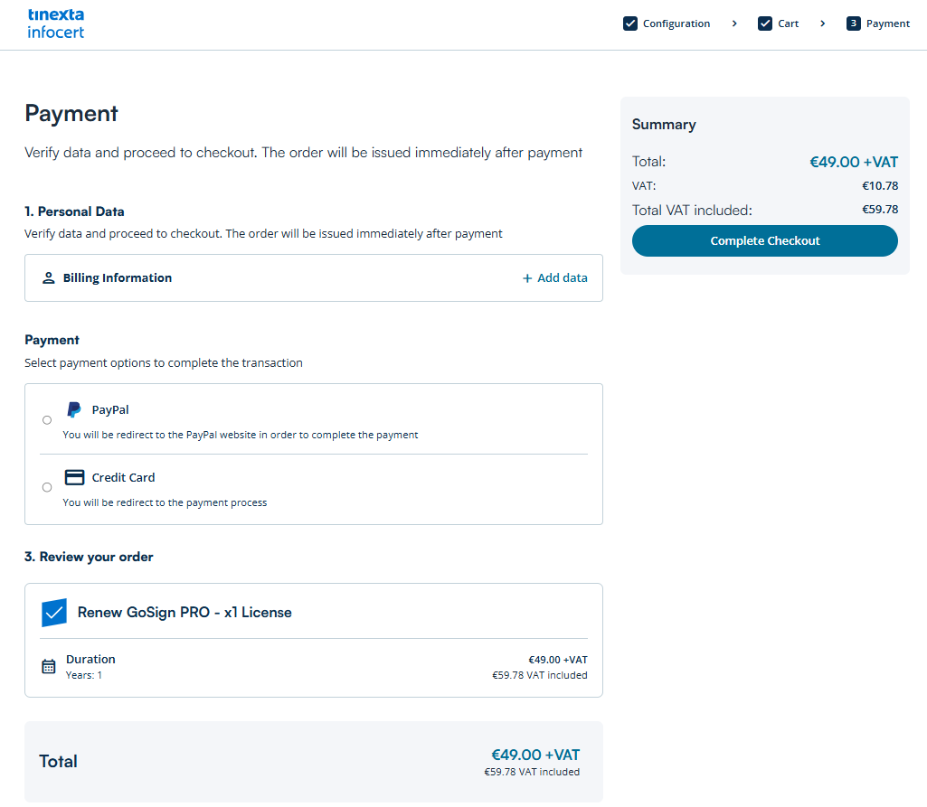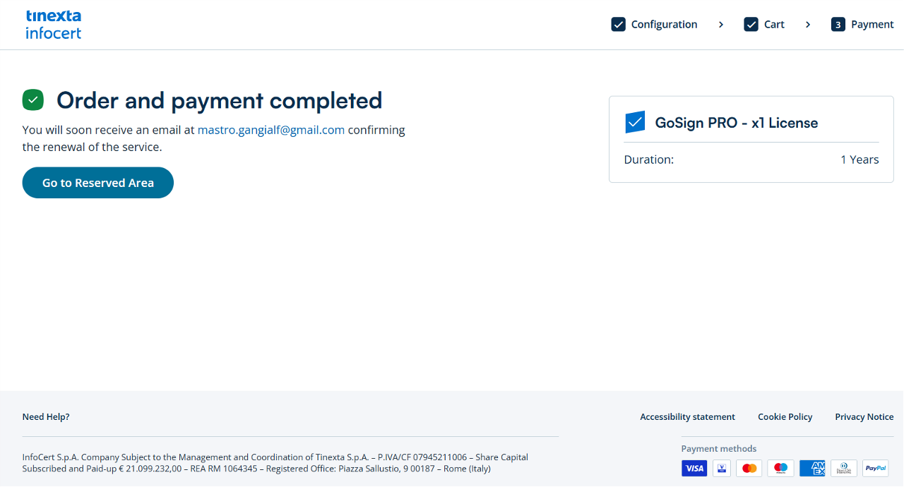 Click "Go to Reserved Area" to access your InfoCert reserved area and check the new expiration date of your GS PRO license.