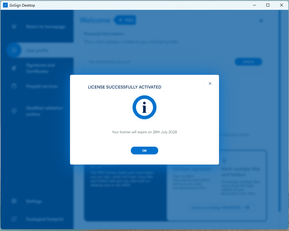 After clicking "Confirm", an on-screen message will indicate that your GoSign PRO license is now successfully activated.