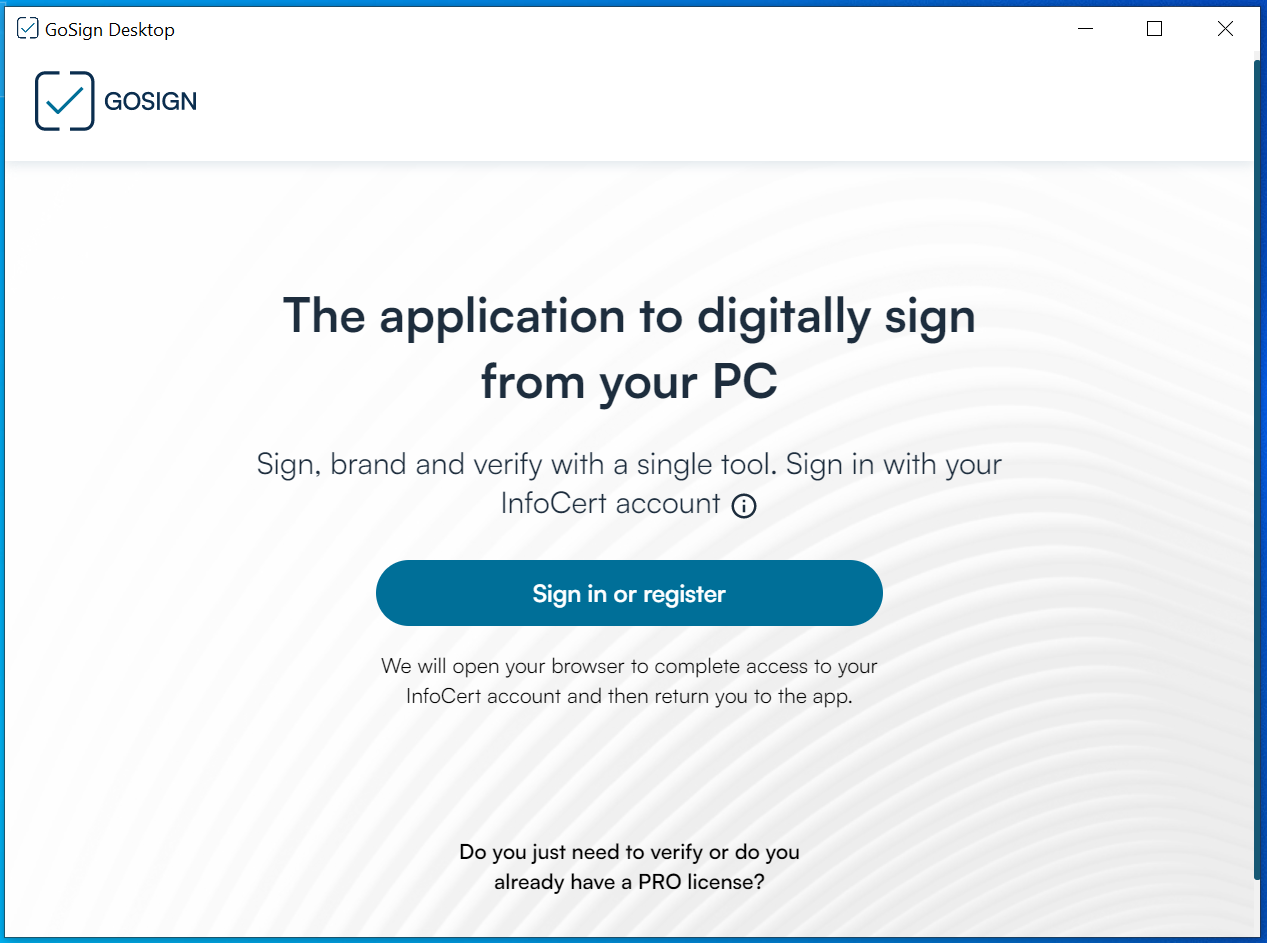 When you start GoSign Desktop, you will be asked to log in with your InfoCert credentials (Customer Area) or, if you do not have one, to register a new InfoCert account.