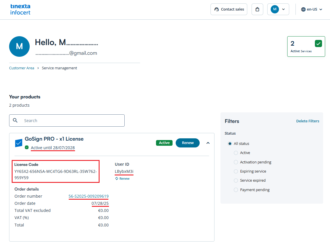 By clicking the "Go to Reserved Area" button, you'll land on the page displaying the services purchased with your registered InfoCert account.