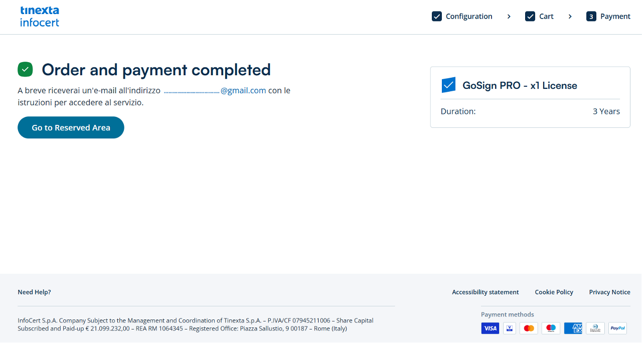Click the "Go to Reserved Area" button to access the InfoCert Customer Reserved Area and view your order information.