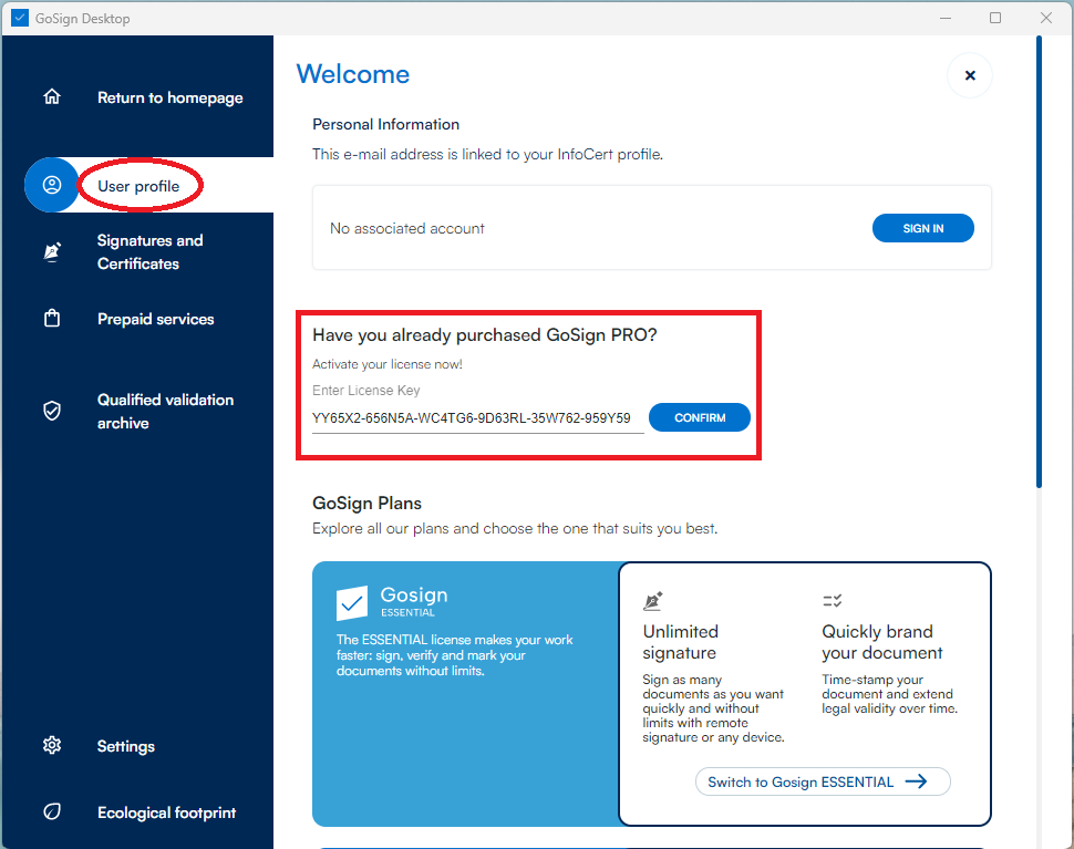 From the left menu, click "User Profile". In the red box in the image, enter the "License Code" found in your InfoCert Reserved Area, next to the purchased service.
