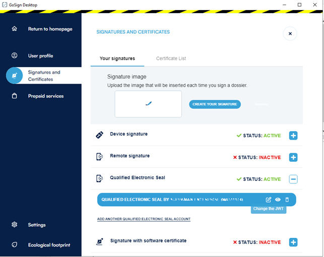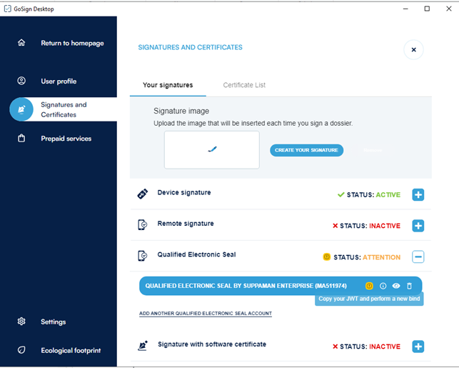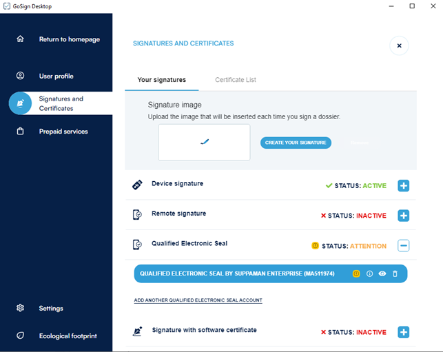 If you wish to access the ESEAL account using the SIGNATURE CONFIGURATION PANEL instead, you must first remove any accounts already configured but currently deactivated.