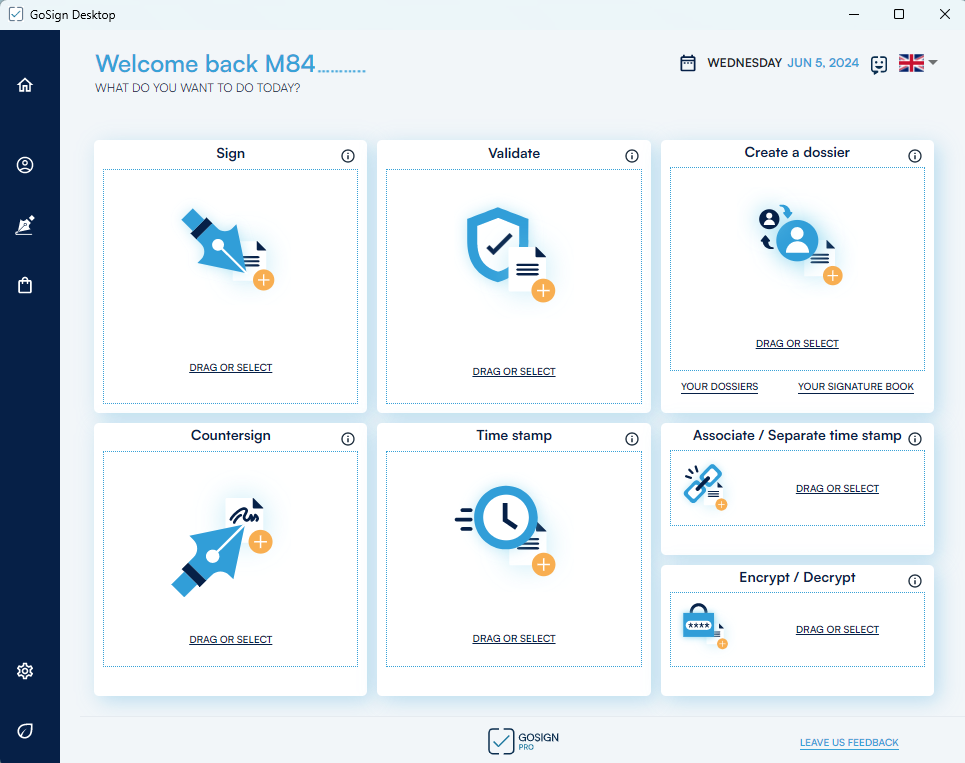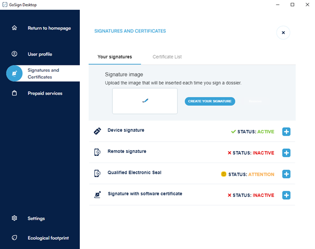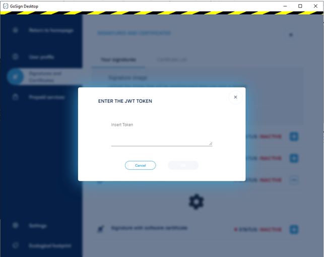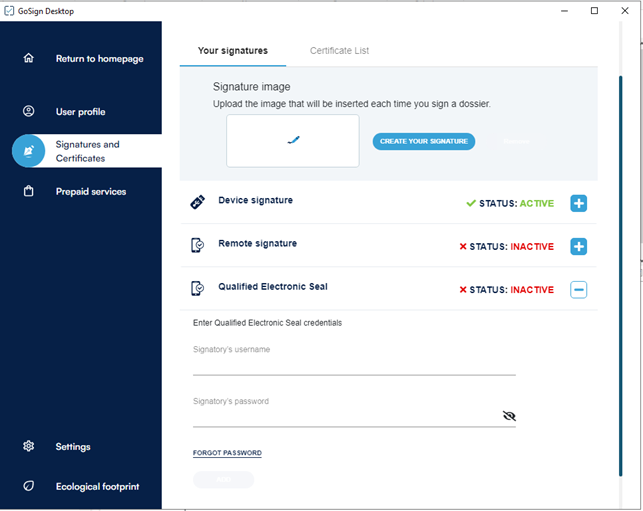 With the 2.1.9 update, the user in possession of an ESEAL certificate already configured in GoSign Desktop will necessarily have to log in again using the user and password credentials of the relevant account, valid for access to MySign.