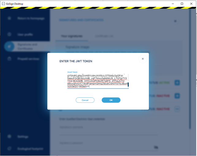 The configuration of the ESEAL account also requires the insertion of a “Virtual OTP Token” / long-lasting JWT), generated via MySign: to facilitate the user it is possible to copy the “Virtual OTP Token” from the previously configured and deactivated account in this update, so that you can insert it for the configuration of the new account.