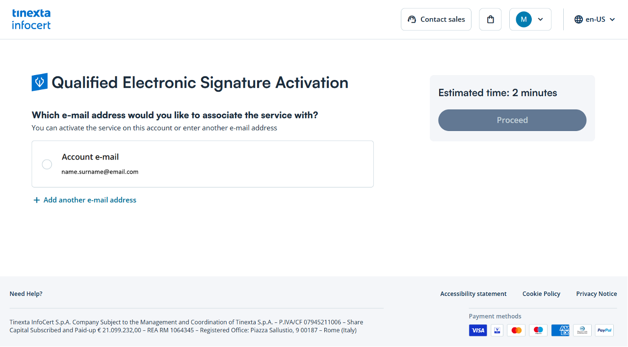After choosing the email address to which you want to associate the digital signature, click on the "Proceed" button.