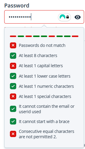 When choosing a password, the requirements needed for it to be valid are shown on the screen.