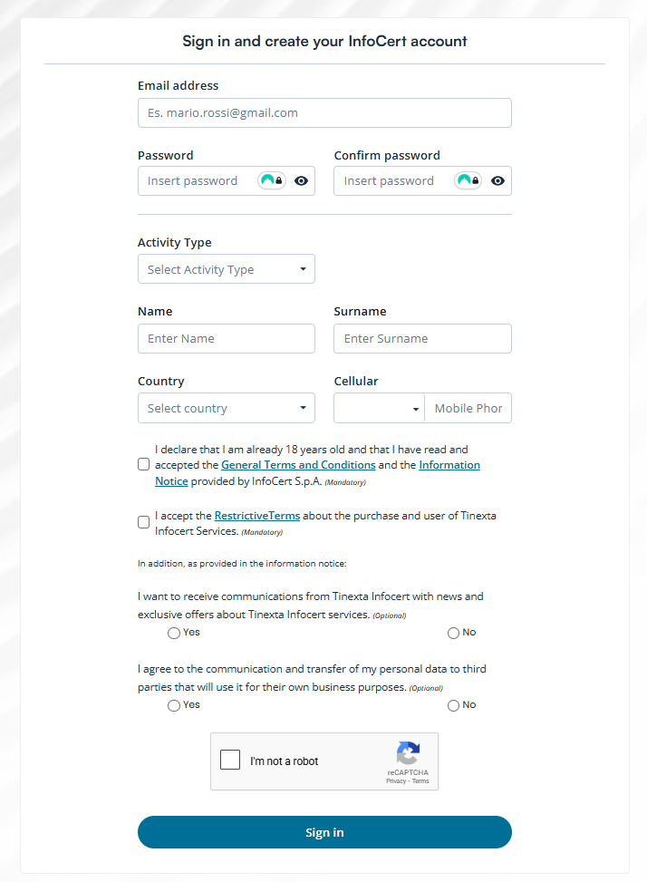 Otherwise, you have to sign up and create a new InfoCert account by clicking on Create your InfoCert account.