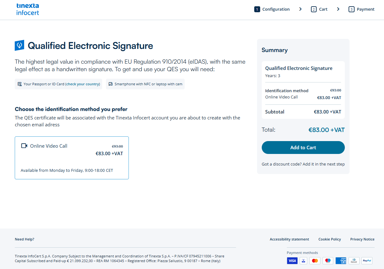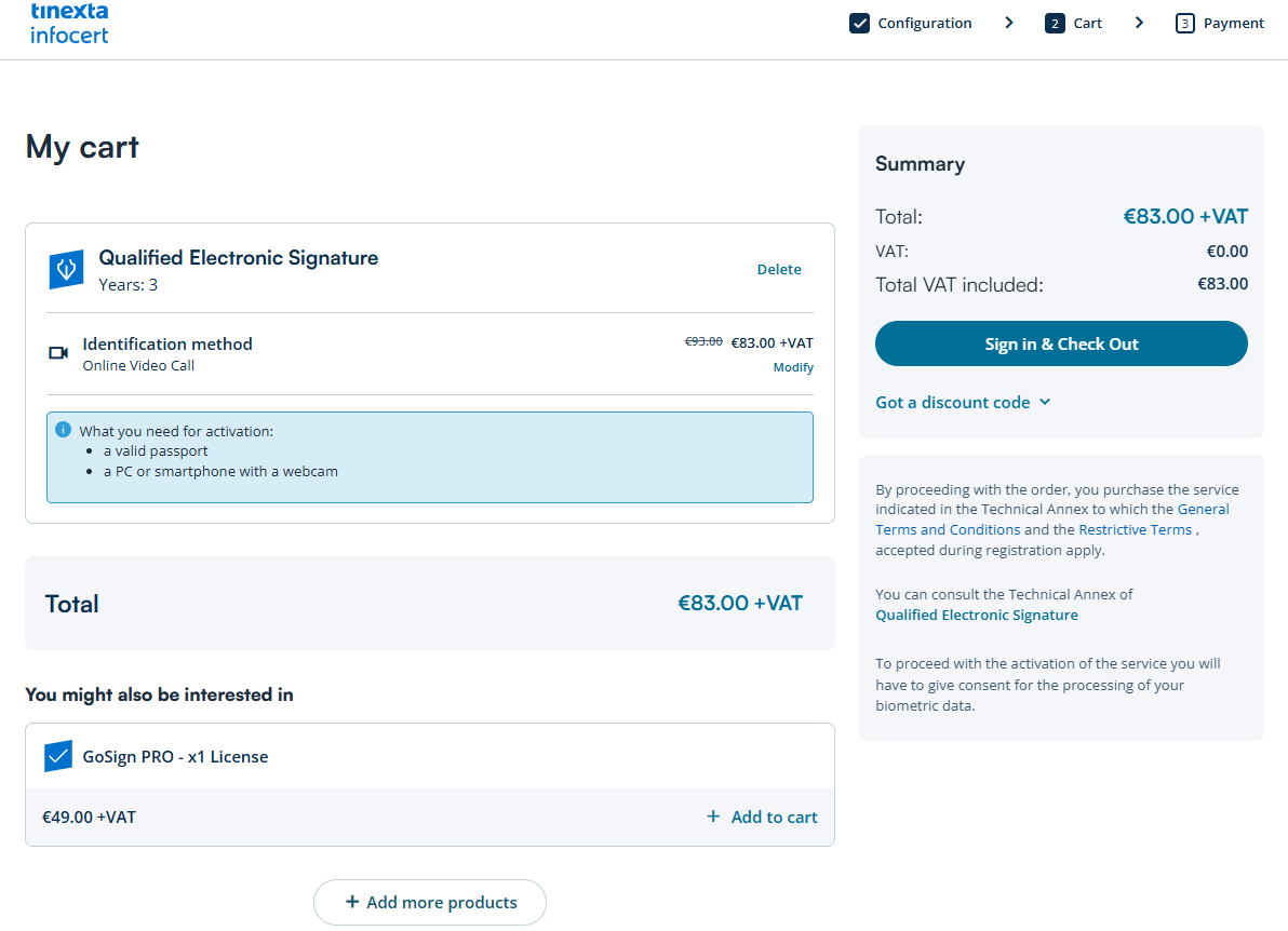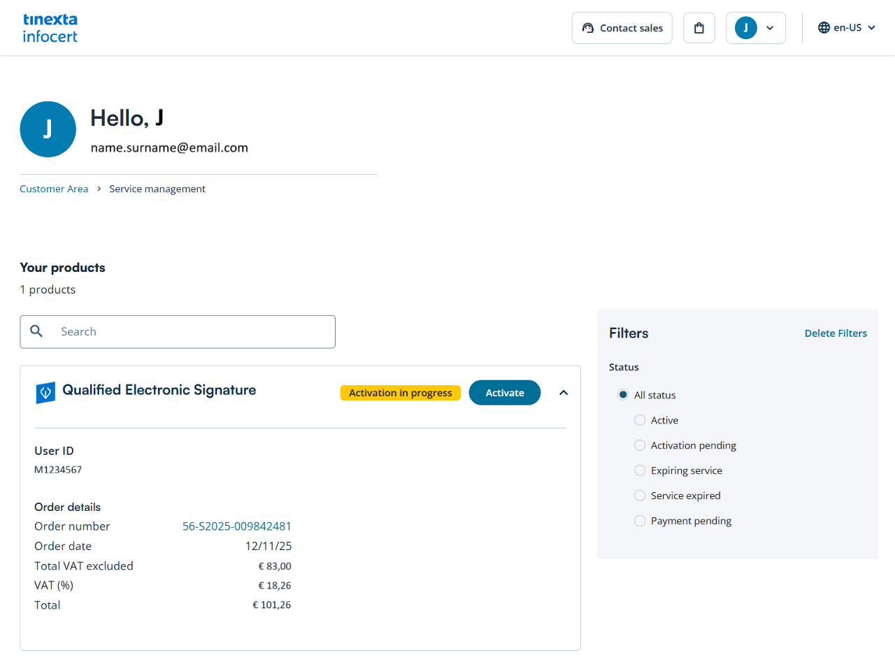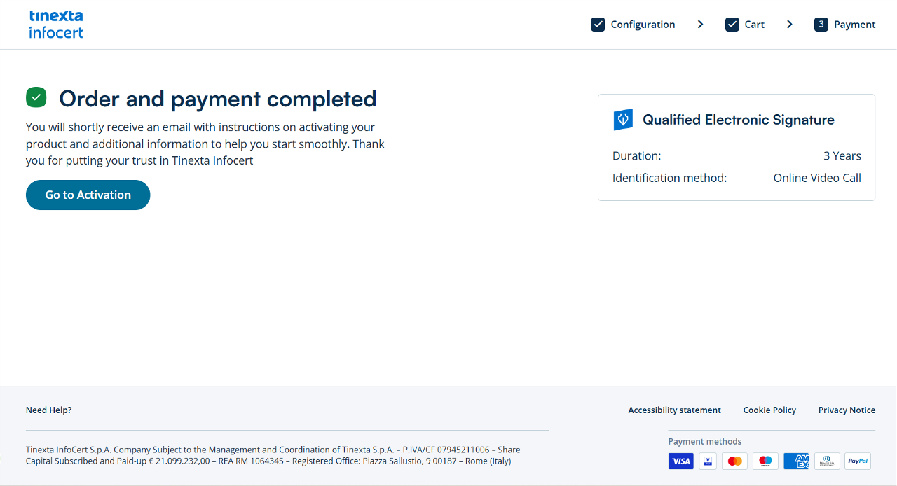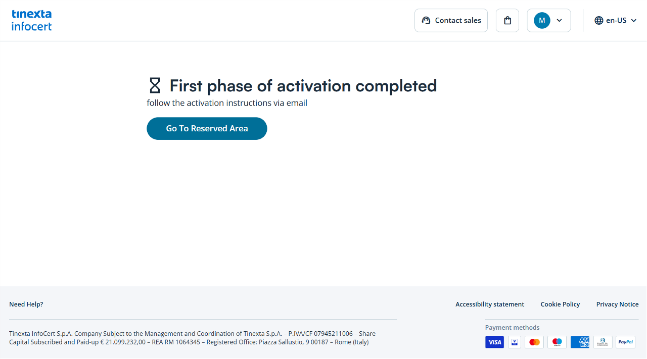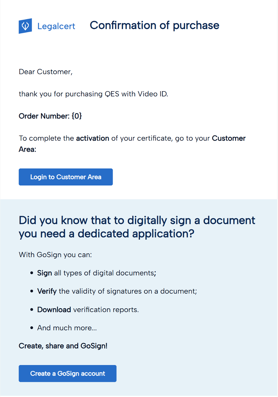 Check your email: you will find the purchase confirmation email with the order number for the service purchased (QES with Video ID) and the button to access your Customer Area of the Tinexta Infocert store.