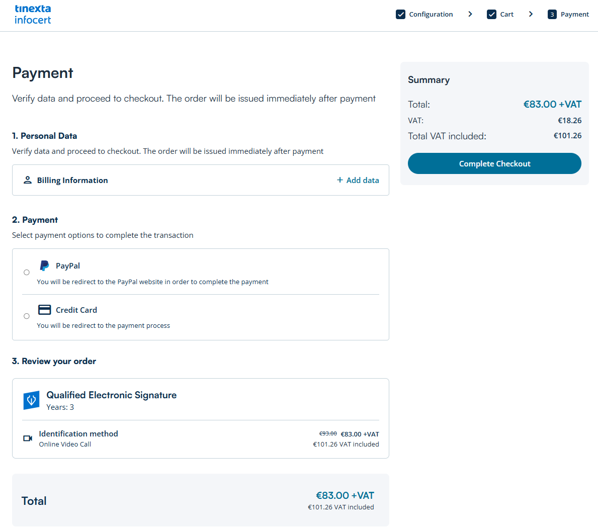 If required, you need to insert your billing data and choose your payment method (Credit card, PayPal). Once done, click on Complete Checkout.