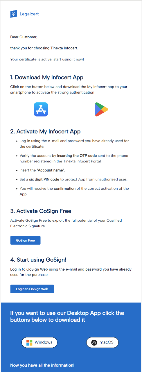 Please note: We recommend that you download the free GoSign Desktop software immediately to use your active QES signing certificate.