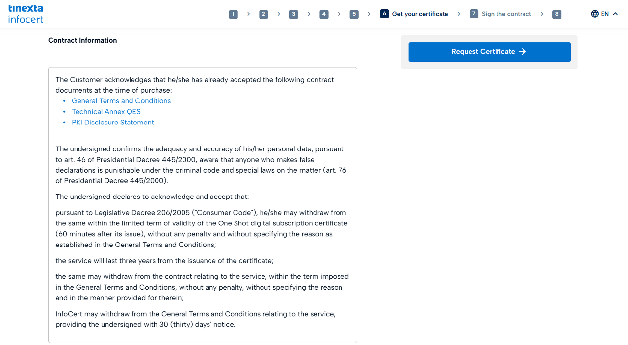 Read the contract information and click Request Certificate.