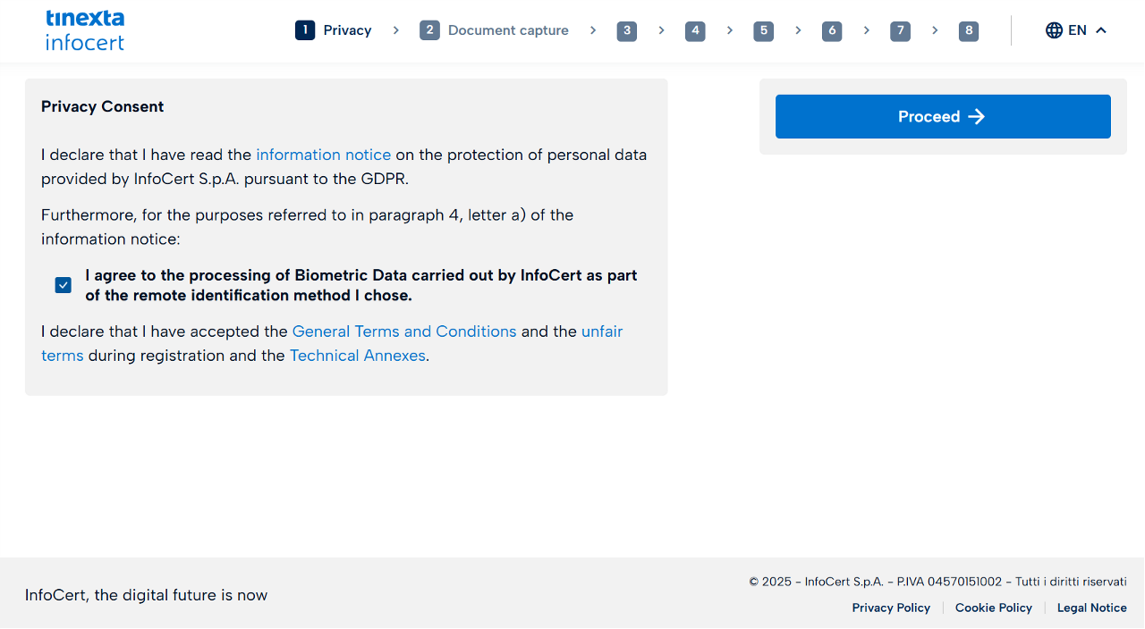 Check the box to consent to privacy and accept the general terms for the identification procedure.