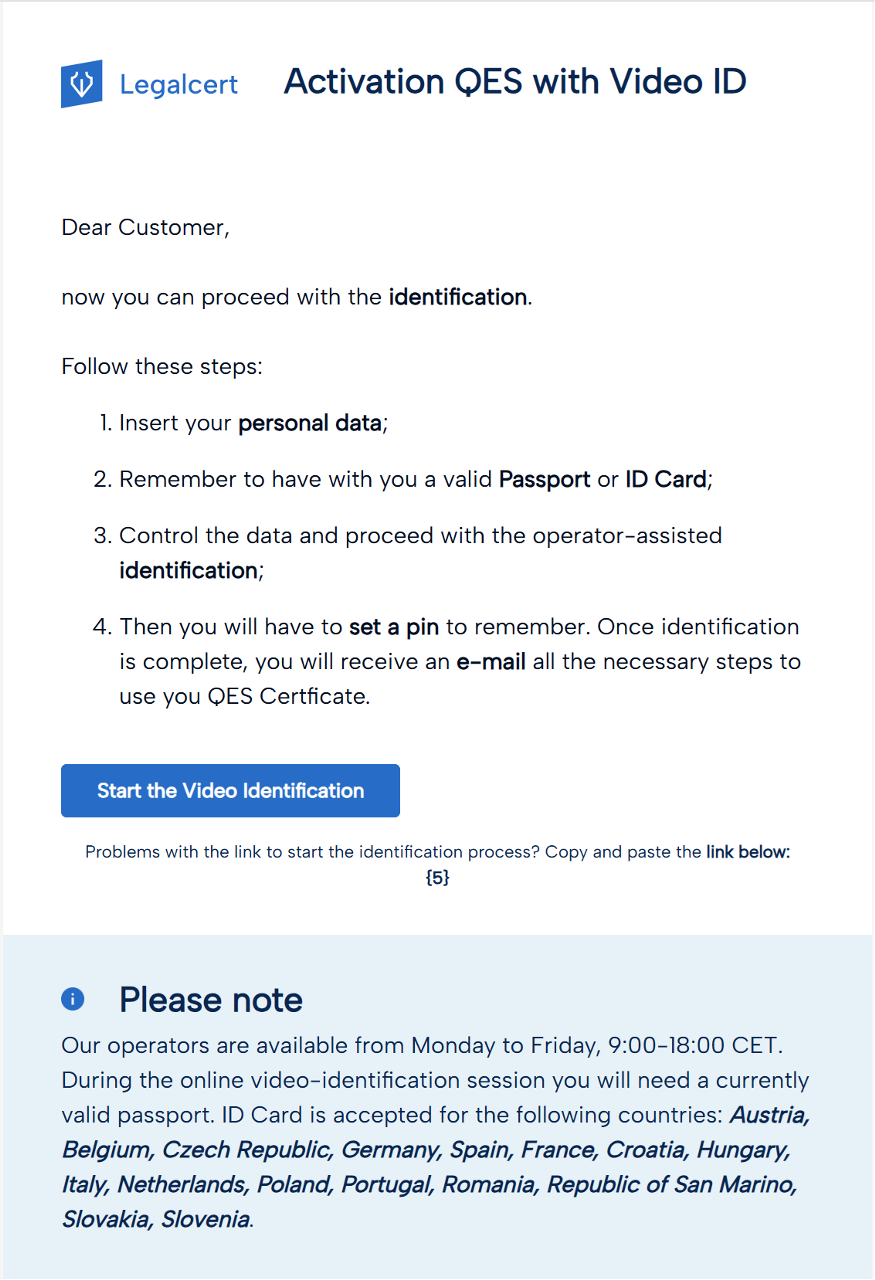 In the "Activation QES with Video ID" email you will find instructions for proceeding to the Identification phase with the Video Operator.