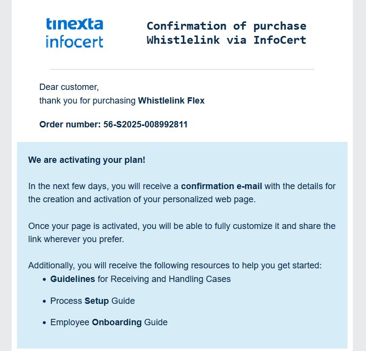 After purchasing, you will receive a confirmation email. Here you will find the details needed to create and activate your personalized web page.