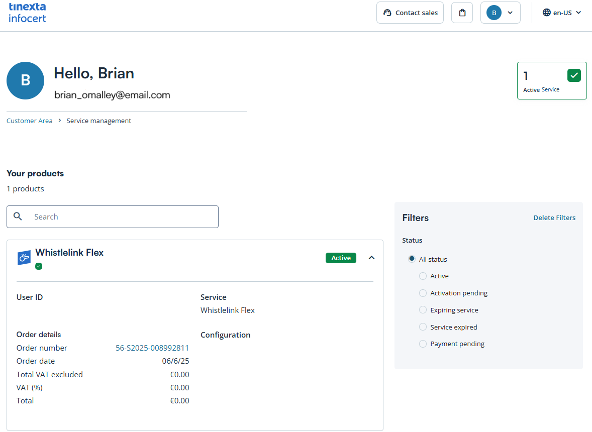Click on the "My Service" box and select the Whistlelink Flex item to view the activation status and the order number of the purchase.