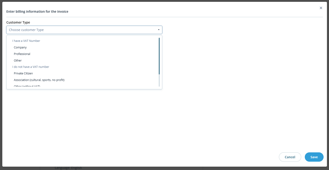 By clicking on "+ Add data" in the "Billing information" field you can enter the required billing information.