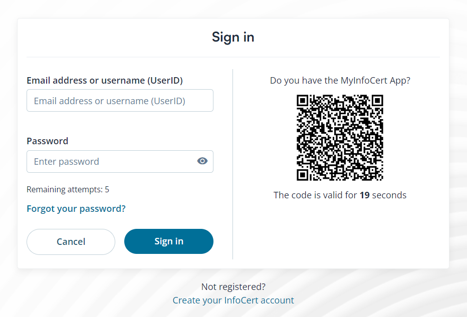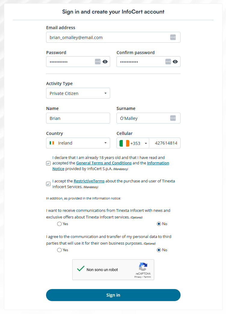 By selecting the "Create your Infocert account" option you will be asked to fill out the registration form, then click on "Sign in".