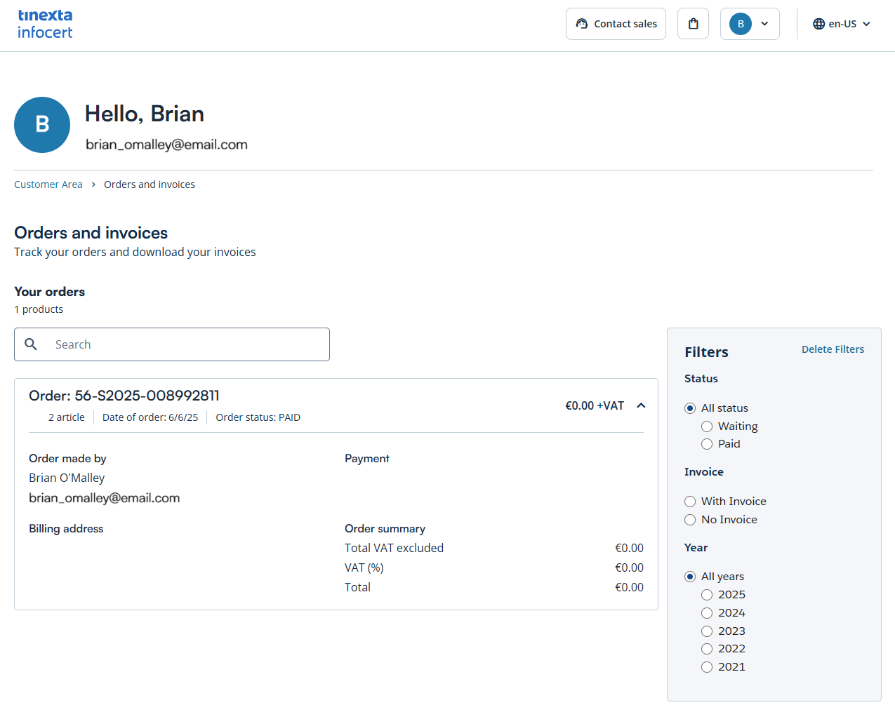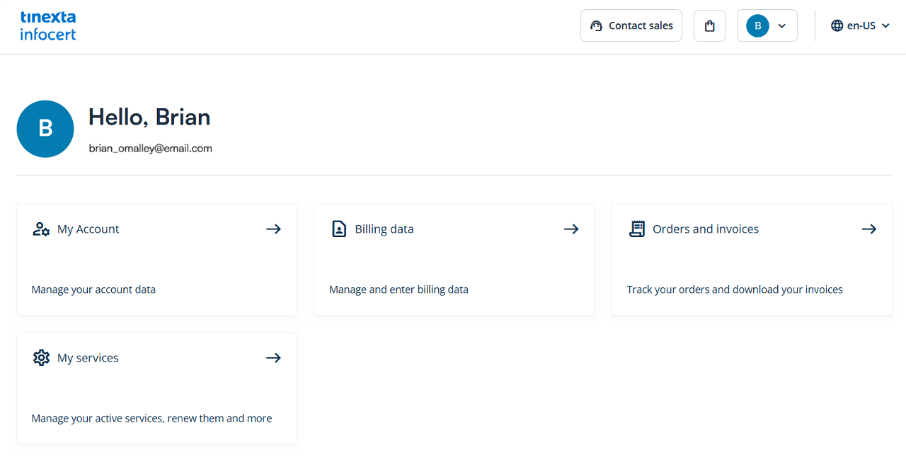 What you find in front of you is the dashboard of the Infocert Customer Area where you can find all the information on your purchases and the activation status of your services.