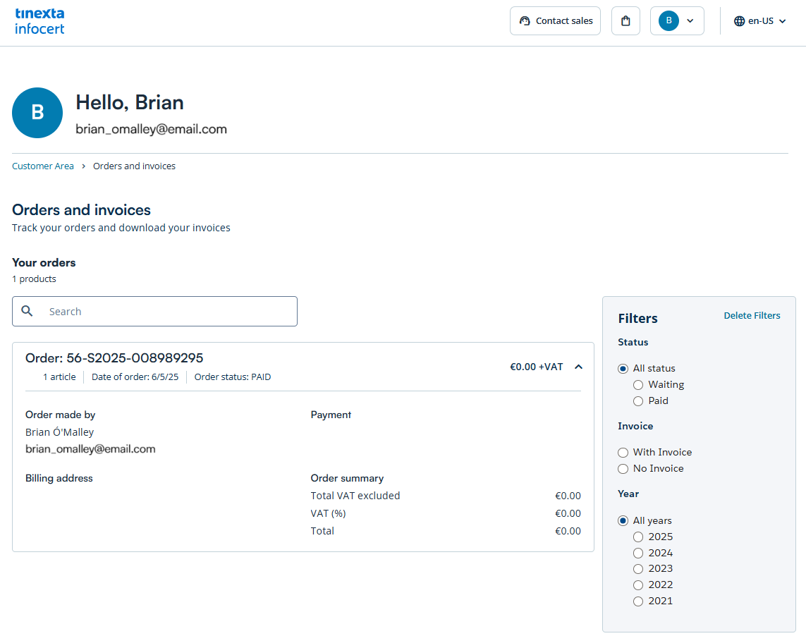 By clicking on "Orders and invoices" you can view the billing details.