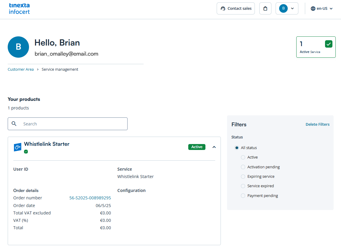 Click on the "My Service" box and select the Whistlelink Starter item to view the activation status and the order number of the purchase.