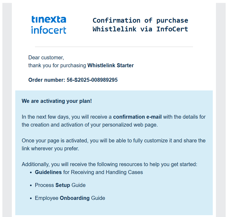 After purchasing, you will receive a confirmation email. Here you will find the details needed to create and activate your personalized web page.