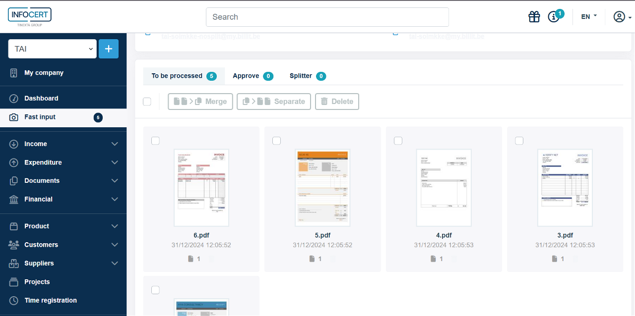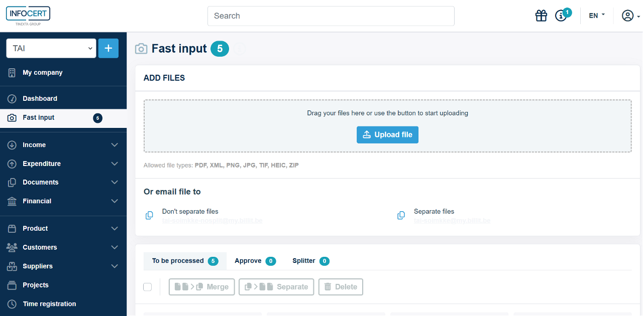 The file will automatically end up in the tab you have opened at the bottom ('To process', 'Approve', or 'Splitter').